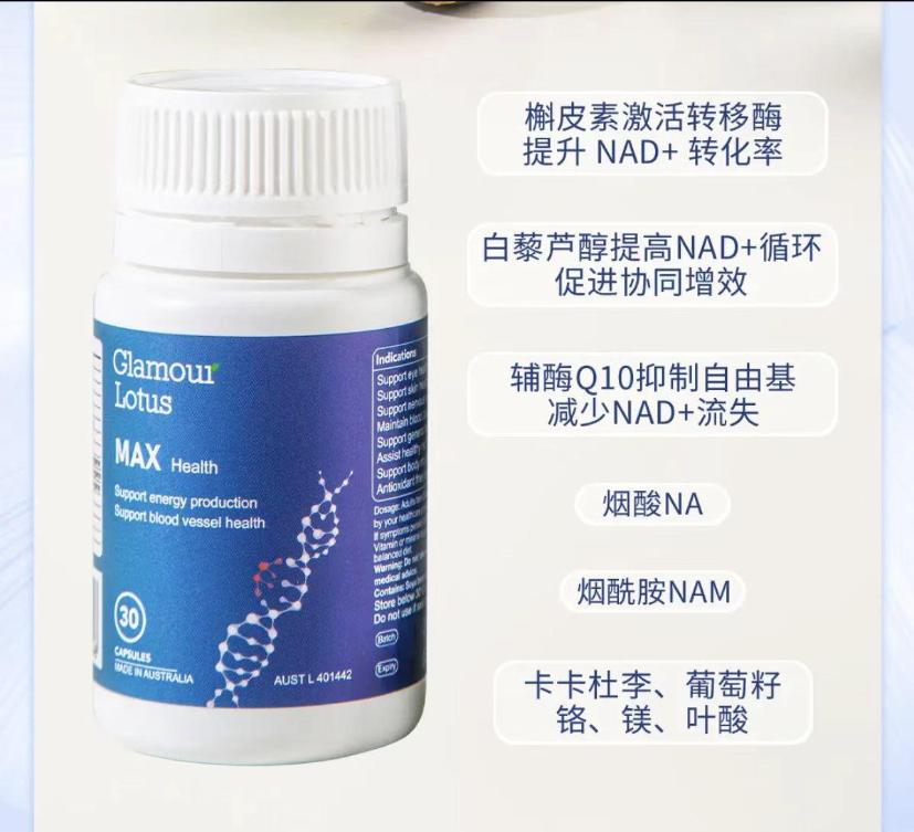 Glamour Lotus MAX Health澳洲歌莱蒙MAX逆龄奇NAD+线粒体修复抗衰软胶囊30粒